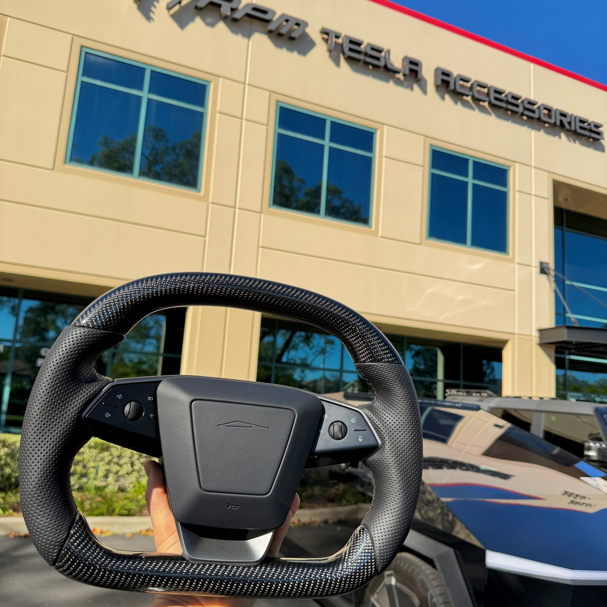 Cybertruck Squircle Sport Steering Wheel - Fully Heated - TESLA OEM Core, Enhanced shaped & Resurfaced in Carbon Fiber & Napa Leather